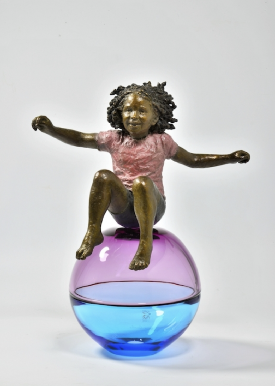 Une sculpture en bronze représentant une jeune fille assise sur une coupe en verre coloré, avec les bras étendus et un sourire.