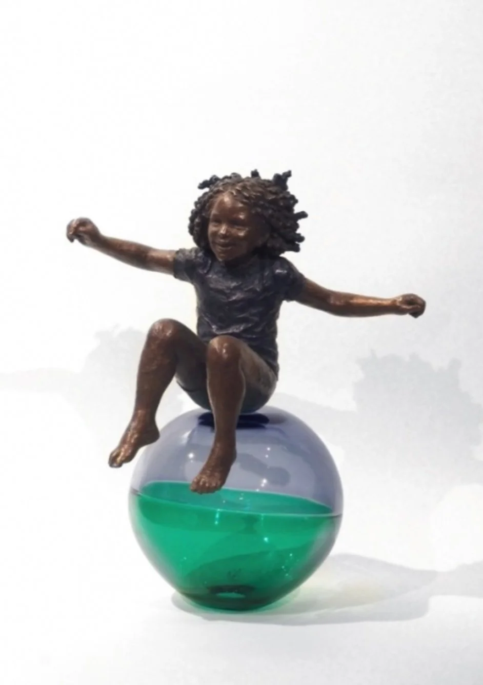 Statue d'une jeune fille assise sur un globe en verre avec de l'eau, souriant, avec des cheveux bouclés, portant une robe, en bronze.
